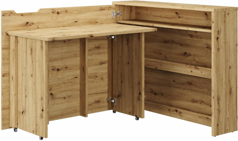 Minimalista stílussal rendelkező WORK CONCEPT kihúzható íróasztal artisan tölgy színben. Tökéletes választás mindazok számára, akik egy multifunkciós bútor darabot keresnek kisebb szobákba vagy egy egyszobás lakásba. Bár első látásra egy keskeny komódnak tűnik, könnyen kihúzható és átalakítható egy tágas íróasztallá polcokkal. Amennyiben néha otthonról dolgozi