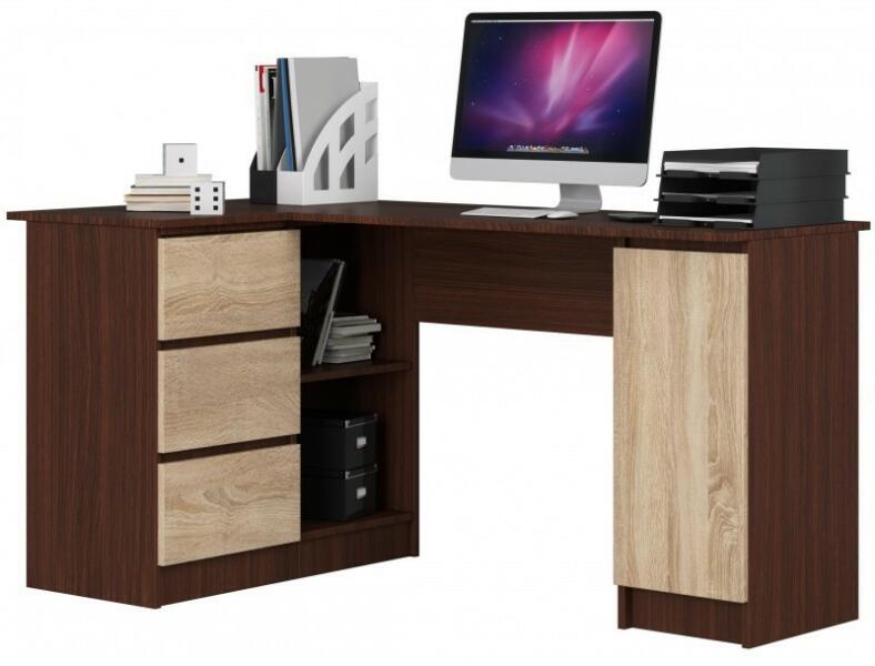 Sarok számítógépasztal fiókokkal és szekrénnyel - B20Test Wenge | Front Sonoma Bal oldali konfigurációKopásálló 16 mm-es laminált lapból készült íróasztal. A látható élek fokozott ütésállóságú ABS élzárással. Sarok íróasztal. Méretek: Hosszúság - 155 cm Magasság - 77 cm Mélység - 85 cm A bal oldali sarok íróasztal két érdekes szín - wenge és sonoma - kom
