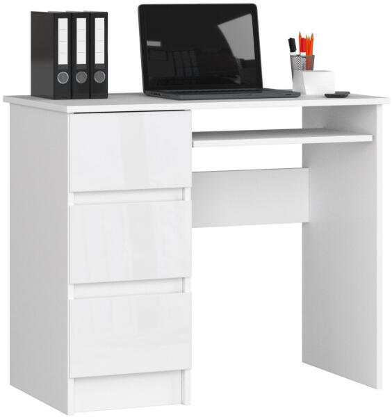 Modern, kompakt számítógépasztal 3 fiókkal és billentyűzettartóval, amely tökéletes választás otthoni irodákba vagy kisebb terekbe. A matt fehér test és magasfényű fehér frontok elegáns skandináv stílust kölcsönöznek a bútornak. Elegáns és praktikus munkaterület kompakt kivitelbenEz a modern számítógépasztal tökéletesen ötvözi a funkcionalitást és az esztétik