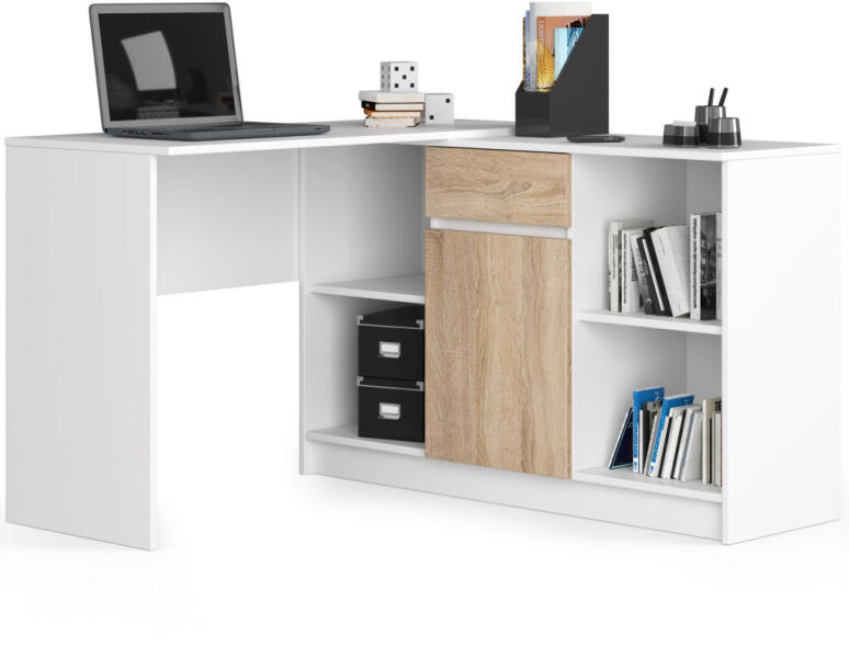 Modern sarok íróasztal és komód kombináció, amely tökéletes megoldást nyújt az otthoni munkavégzéshez. A fehér és sonoma tölgy színkombináció, valamint a praktikus tárolóhelyek ideális választássá teszik mind otthoni irodába, mind gyerekszobába. Sokoldalú sarok munkaállomás maximális tárolókapacitássalEz az innovatív sarok íróasztal-komód kombináció tökélet