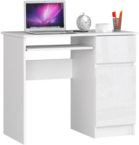 Modern, kompakt számítógépasztal kihúzható billentyűzettartóval és tágas tárolóhellyel. Magasfényű fehér kivitelben, ideális kisebb terekbe, tökéletes választás otthoni irodába vagy diákszobába. Kompakt és stílusos munkaterület modern otthonokbaAz AKORD Piksel számítógépasztal tökéletes megoldást kínál a korlátozott térrel rendelkező otthonok számára. A 90 c