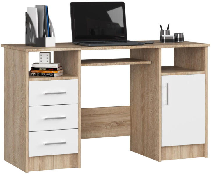 Modern számítógépasztal laminált bútorlapból, sonoma tölgy korpusszal és fehér frontokkal. Praktikus kialakítású, kihúzható billentyűzettartóval, 3 fiókkal és ajtós tárolórésszel a maximális funkcionalitásért. Sokoldalú számítógépasztal otthoni és irodai használatraAz Ana számítógépasztal tökéletes választás mind otthoni munkavégzéshez, mind irodai körny