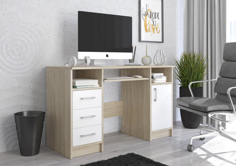 Tetszetős színekben rendelhető modern stílusú íróasztal. Visszafogott , mégis korszerű megjelenése miatt remekül illik számos irodába és dolgozószobába , ideális munkára és tanuláshoz. Anyaga: Korpusz és frontok - laminált tábla 16mm vastag. Szegély - magas minőségű PVC nagy mechanikai és kémiai ellenállás. Billentyűzet tartó - görgős megoldás garantálja a kén