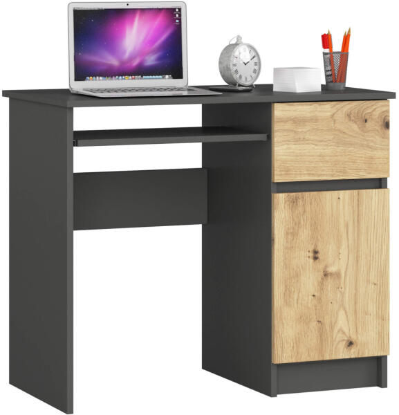 Kompakt és sokoldalú számítógépasztal, amely tökéletes megoldást nyújt kis terekbe. A 90 cm széles asztal kihúzható billentyűzettartóval, fiókkal és tárolószekrénnyel rendelkezik, modern grafit szürke és artisan tölgy színkombinációban. Kompakt és funkcionális munkaterület kis terekbeA Piksel számítógépasztal egy intelligensen megtervezett bútor, amely maximálisa