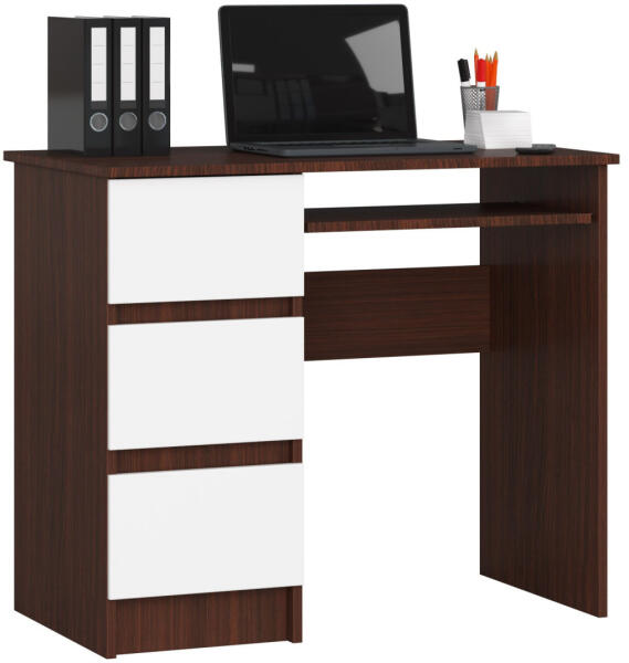 Modern, kompakt számítógépasztal wenge színű korpusszal és fehér fiókfrontokkal, kihúzható billentyűzettartóval. Ideális választás otthoni irodába vagy munkaállomáshoz, praktikus tárolási megoldásokkal. Modern és funkcionális számítógépasztal hatékony munkavégzéshezAz AKORD CLP A-6 számítógépasztal tökéletes választás azoknak, akik egy kompakt, mégis sokolda