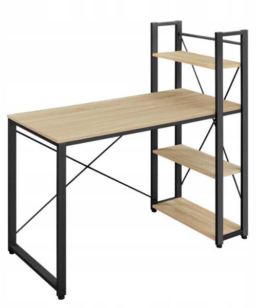 Íróasztal TAYLOR SONOMA polccal 120x60cm a fekete fém és a sonoma tölgy dekor kombinációját kínálja, amely elegáns és egyben praktikus megjelenést kölcsönöz neki. A hárompolcos integrált polc révén elegendő tárolóhelyet biztosít könyvek, dokumentumok vagy dekorációk számára, amelyeket kéznél szeretne tartani. A 120 x 60 cm-es méretek tágas munkafelületet biztosít