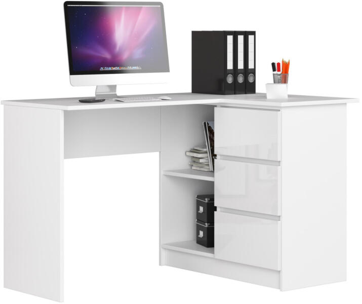 Modern sarok számítógépasztal 3 fiókkal és polcokkal, amely tökéletes választás otthoni irodába vagy munkahelyre. A fehér magasfényű kivitel és a praktikus kialakítás egyesíti az eleganciát a funkcionalitással. Elegáns és praktikus sarokasztal modern munkakörnyezethezEz a 124,5 cm hosszú sarok számítógépasztal tökéletes megoldást kínál a hatékony munkavégzéshez.