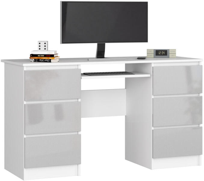 Modern, 135 cm széles számítógépes íróasztal 6 fiókkal és billentyűzettartóval. Fehér laminált lapból készült metál fényes frontokkal, ideális otthoni vagy irodai munkához. Elegáns és funkcionális munkaterület modern designnalAz AKORD A-11 számítógépes íróasztal tökéletes választás azoknak, akik praktikus és stílusos bútort keresnek. A 135 cm széles asztal 6 t
