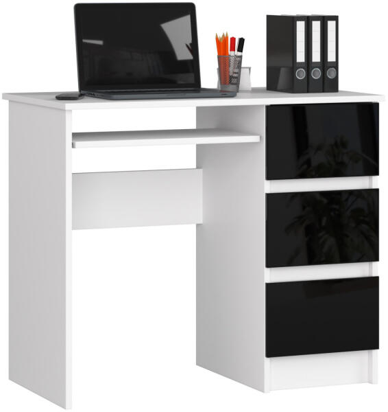 Modern, kompakt számítógépasztal kihúzható billentyűzettartóval és három tágas fiókkal. A fehér váz és a magasfényű fekete fiókok elegáns kontrasztot alkotnak, tökéletes választás otthoni irodákba vagy tanulósarokba. Stílusos és praktikus számítógépasztal modern otthonokbaAz AKORD CLP A-6 számítógépasztal a modern design és a praktikus funkcionalitás tökélete
