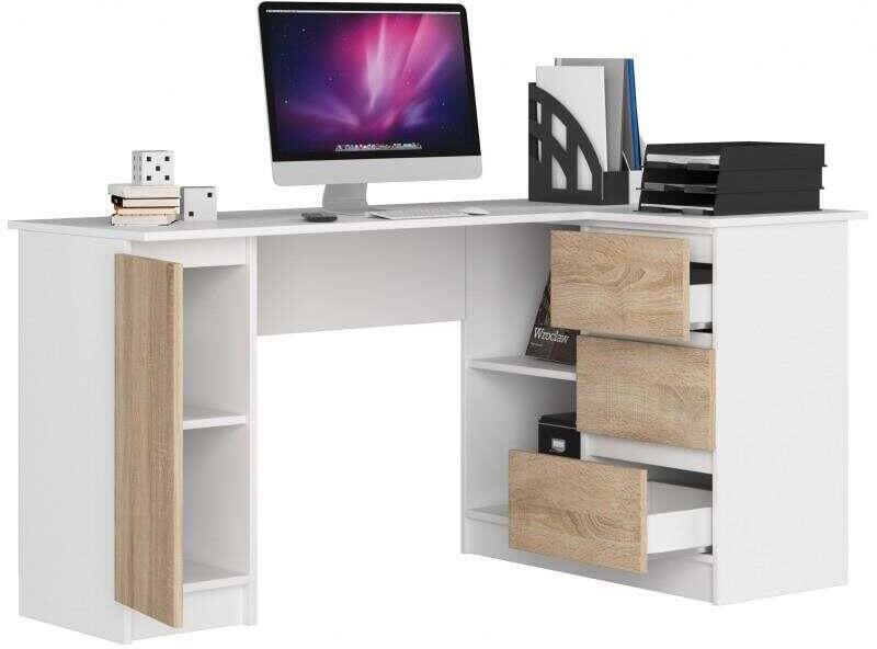 Sarokszámítógép asztal, laminált lap, 3 fiók, 4 polc, fehér és tölgy, 155x85x77 cm A sarokiroda egy modern ajánlat, amely a fiatalok igényeire reagálva jött létre, akik folyamatosan innovatív, funkcionális, de egyben esztétikus megoldásokat keresnek. A számítógépes asztal polcokkal és fiókokkal ideális azoknak, akik berendezik a dolgozószobájukat. A bútor minden bizonny