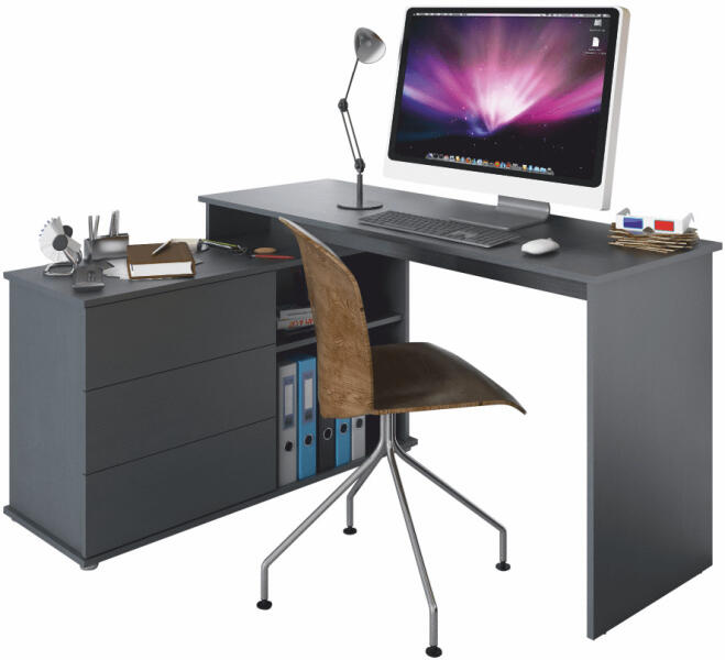 Univerzális sarok PC asztal, grafit, TERINO Irodabútorok > Számítógépasztalok Anyag: laminált DTD Szín: grafit Méretek (SzxVxH): 138x50/110x75,4 cm Anyag vastagsága: 16 mm Univerzális 3 fiók Nyitott polc A fiok elolapjanak oldalan túlnyúlik Térbe is helyezhető Minőségi szlovák termék Szétszerelve szállítva