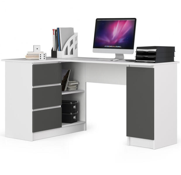 Modern, baloldali sarok íróasztal praktikus tárolási megoldásokkal, amely tökéletes választás otthoni irodákba és gyerekszobákba. A fehér és szürke színkombináció, valamint a 155 cm-es szélesség optimális munkaterületet biztosít. Sokoldalú sarok íróasztal maximális funkcionalitássalA B20 sarok íróasztal egy kifinomult bútor, amely egyesíti a modern dizájnt és a pr