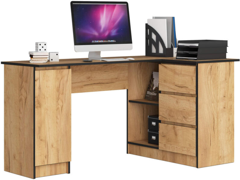 Modern és praktikus sarok íróasztal laminált fából, amely tökéletes megoldást kínál az otthoni irodába vagy munkahelyre. A Craft tölgy kivitelezésű bútor három fiókkal, egy ajtóval és négy polccal rendelkezik, maximális tárolási lehetőséget biztosítva. Optimális térkihasználás és funkcionalitás egy bútorbanEz a jobbos kialakítású sarok íróasztal tökéletesen