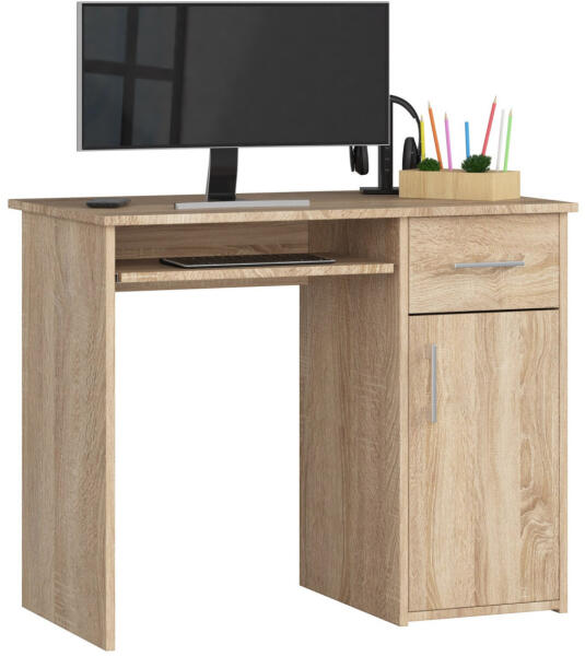 Praktikus és modern számítógépasztal Sonoma tölgy színben, amely tökéletes választás otthoni vagy irodai munkához. A 90 cm széles asztal kihúzható billentyűzettartóval, tárolószekrénnyel és fiókkal rendelkezik. Kompakt és sokoldalú számítógépasztal mindennapi használatraA PIN számítógépasztal egy praktikus és stílusos bútor, amely tökéletesen ötvözi a funkci