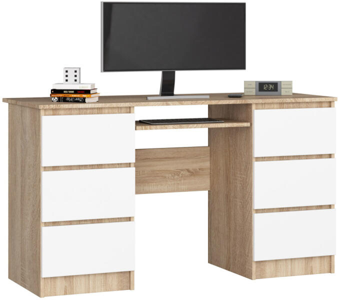 Modern, praktikus íróasztal 6 fiókkal, kihúzható billentyűzettartóval és tágas munkafelülettel. A sonoma tölgy és fehér színkombináció elegáns megjelenést kölcsönöz, míg a laminált lap és ABS élzárás tartósságot biztosít. Sokoldalú íróasztal maximális tárolóhellyelAz AKORD CLP A-11 íróasztal tökéletes választás otthoni irodába vagy munkahelyre. A 135 cm s