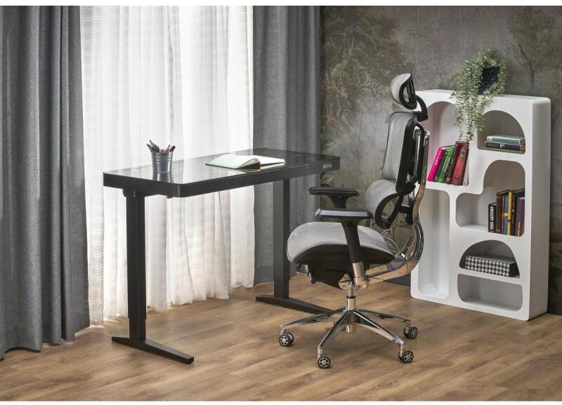 B52 íróasztal állítható magassággal, fekete Méretek: 120/60/77-120 cm Íróasztal állítható magassággal / érintőgombok / vezeték nélküli töltés / USB Anyaga: üveg / porszórt acél Szín: fekete - Mindigbútor