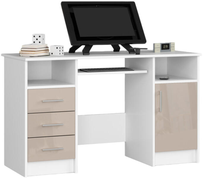 Modern és praktikus számítógépasztal laminált lapból, fehér és cappuccino magasfényű kivitelben. Kihúzható billentyűzettartóval, három fiókkal és tárolószekrénnyel felszerelt, ideális otthoni vagy irodai használatra. Elegáns és funkcionális munkaterület modern környezetbenAz Ana számítógépasztal tökéletes választás azoknak, akik egy stílusos és praktikus búto