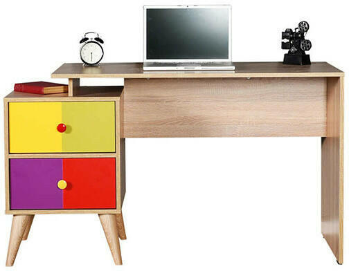 Bútorok ABC szerint > Irodabútor > Íróasztal - Az asztalnak két fiókja van, kerek fogantyúval elülső része és nyele különböző színű. A fiókokat golyóscsapágy-vezetők nyitják. Az asztal ergonomikus és stílusos kialakítású. Nagy munkaterülete van, mérete 128 × 57 cm. Az íróasztal tetején található egy nyílás a kábelek számára, így használhatja számít