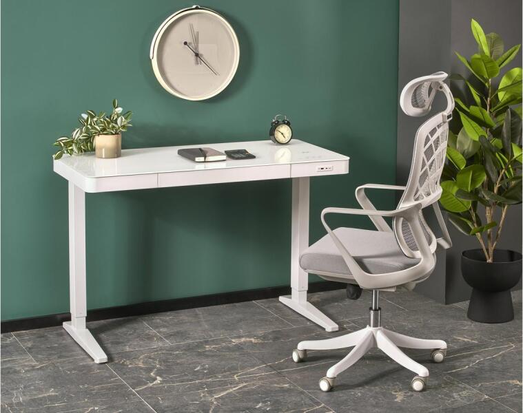B52 íróasztal állítható magassággal, fehér Méretek: 120/60/77-120 cm Íróasztal állítható magassággal / érintőgombok / vezeték nélküli töltés / USB Anyaga: üveg / porszórt acél Szín: fehér - Mindigbútor