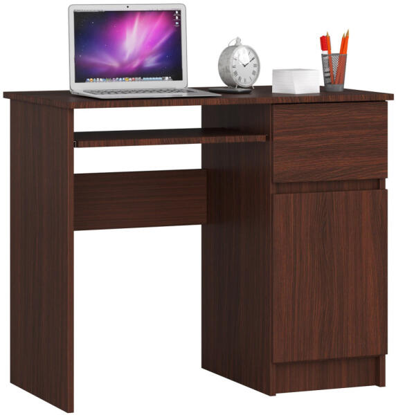 Kompakt és praktikus számítógépasztal 90 cm szélességgel, ideális kisebb terekbe. Kihúzható billentyűzettartóval, fiókkal és tárolószekrénnyel rendelkezik, wenge színű laminált kivitelben. Kompakt és sokoldalú számítógépasztal otthoni vagy irodai használatraAz AKORD Piksel számítógépasztal tökéletes választás kisebb terekbe. A 90 cm széles asztal praktikus kiala
