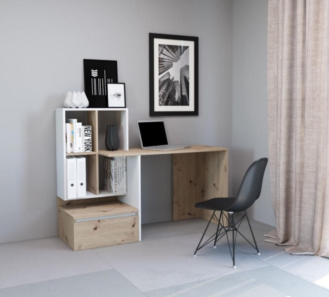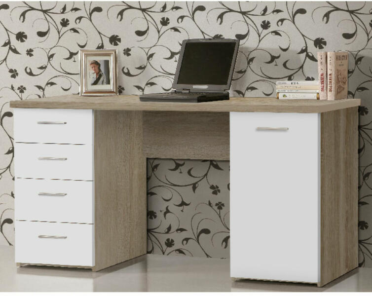 Bútorok ABC szerint > Irodabútor > Íróasztal - Íróasztal rengeteg tárhellyel rendelkezik, a fiók ajtaja fehér matt színű, az asztallap sonoma tölgy színű. Balra négy fiók található, jobbra egy szekrény. Terhelhetősége: 20 kg, a fiókoknak és a polcnak 5 kg. Mérete:145x60x76,3 cm