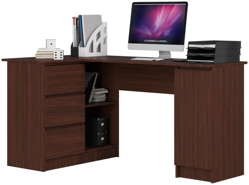 Modern, baloldali sarokíróasztal wenge színben, amely tökéletes megoldást kínál az otthoni irodába vagy dolgozószobába. Három fiókkal, polcokkal és tágas munkafelülettel rendelkezik, biztosítva a hatékony munkavégzést és rendszerezett tárolást. Elegáns és funkcionális sarokíróasztal maximális munkaterülettelEz a modern vonalvezetésű baloldali sarokíróasztal töké