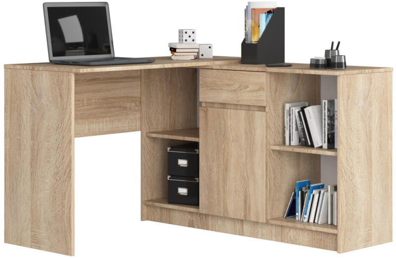 Innovatív sarok íróasztal és komód kombináció, amely maximális helykihasználást biztosít. A praktikus kialakítású bútor Sonoma tölgy színben, tartós laminált bútorlapból készült, és rugalmasan átalakítható jobb vagy bal oldali elrendezésűvé. Sokoldalú és praktikus sarok munkahely megoldásA CLP B-17 sarok íróasztal és komód szett egy átgondolt, modern irodai b