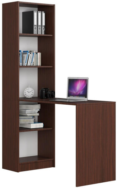 Modern, többfunkciós íróasztal beépített könyvespolccal, amely tökéletes megoldást nyújt az otthoni munkavégzéshez vagy tanuláshoz. A wenge színű, laminált bútorlapból készült bútor ötvözi a praktikusságot az elegáns megjelenéssel. Innovatív térkihasználás és funkcionalitás egy bútorbanEz a wenge színű, modern íróasztal-könyvespolc kombináció tökéletes me