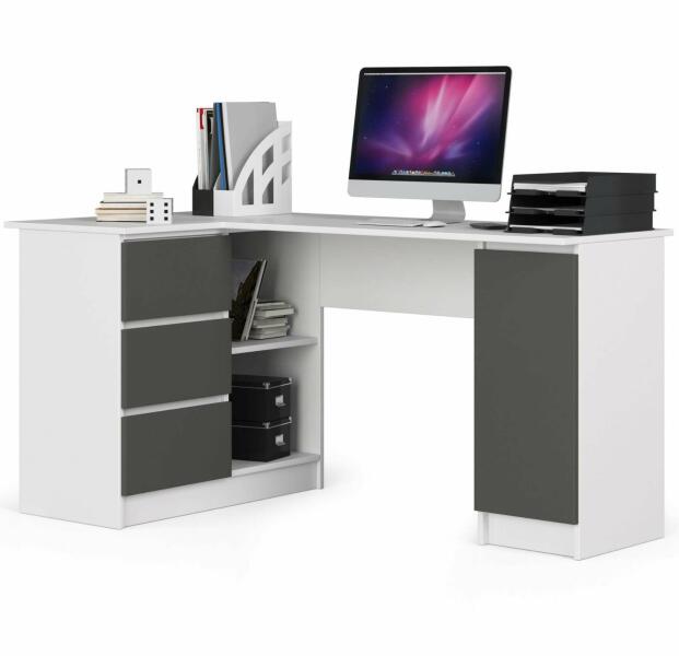 Szín Fehér | frontok Grafitszürke Bal oldali konfiguráció 16 mm-es laminált, kopásálló lemezből készült íróasztal. A látható élek ABS-szegéllyel borítottak a fokozott sérülésállóság érdekében. Sarokasztal. Méretek: Hosszúság - 155cm Magasság - 77cm Mélység - 85cmSarokasztal B20 155cm LEFT fehér / grafitszürke színben egy elegáns, modern kialakítású irodabút