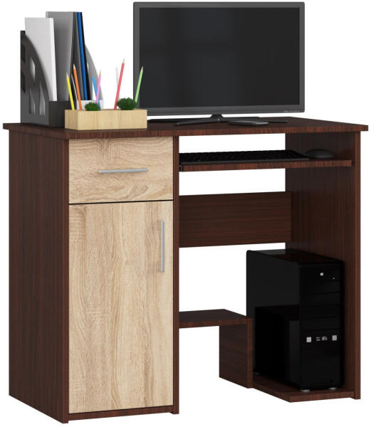 Modern és praktikus számítógépasztal 90 cm-es méretben, wenge és sonoma tölgy színkombinációban. Laminált bútorlapból készült, ABS élzárással a tartósság érdekében, kihúzható billentyűzettartóval és tágas tárolóhelyekkel. Sokoldalú munkaterület otthoni irodájáhozAz AKORD JAY számítógépasztal tökéletes választás mind otthoni munkavégzéshez, mind tanulás