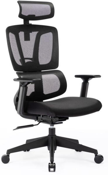 -hálós, magas háttámla -állítható magasságú és dőlésszögű fejtámla -állítható magasságú és mélységű deréktámasz -fekete kárpitozott ülőlap -lábtartóval -1D karfa, puha támfelület -automata szinkronmechanika (antishock) -műanyag lábkereszt d. 700 -d. 50 görgők -teherbírás: 110 kg -napi használati idő: 5-7 óra -teljes magasság: 115-129 cm -ülésmagasság: