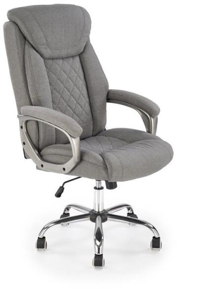 Szürke szövet kárpitozású irodai forgószék vastag szivacspárnázattal, fix karfával valamint állítható rugózási keménységű hintamechanikával. Az ülésmagasságot a beépített gázlift segítségével állíthatja be használója, görgői pedig könnyű mozgathatóságot tesznek lehetővé. Bemutatótermünkben megtekinthető