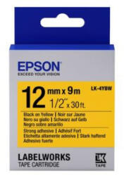 12 mm széles, 9 m hosszú, sárga alapon fekete betűs, erős tapadású címkeszalag műanyag tartós feliratok nyomtatásához. Epson Label Cartridge Strong Adhesive LK-4YBW Black/Yellow 12mm (9m), Consumables: Tapes, Strong adhesive, Yellow, Black, 12ÿmm, 9ÿm