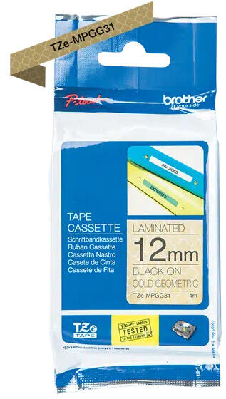 12 mm széles, 4 m hosszú címkeszalag, aranyszínű geometria minta alapon fekete betűs laminált feliratok nyomtatásához. 12 mm széles, 4 m hosszú címkeszalag, aranyszínű geometria minta alapon fekete betűs laminált feliratok nyomtatásához. Az következő szalagnyomtatókhoz: (A nyomtatókon szereplő szám utáni betűkód nem változtat a kompatibilitások, hagyd figyelmen kívül