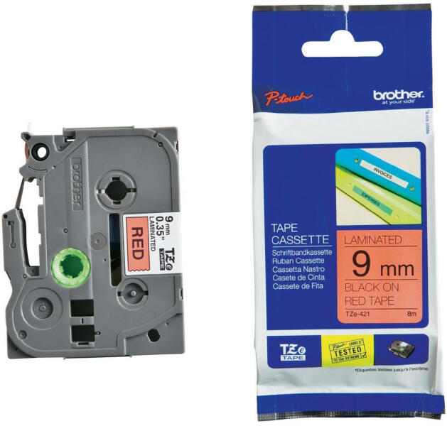 Brother TZE-421 laminált P-touch szalag (9mm) Black on Red - 8m