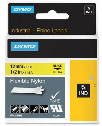 Feliratozógép szalag, flexibilis ID, 12 mm x 3,5 m, DYMO "Rhino", sárga-fekete DYMO Rhino gépekkel használható rugalmas nylon: kifejezetten vezetékek és káblek jelölésére alkalmazási felület: sima, lapos, mintázott, porbevonatú, ívelt, kábelek és vezetékek ellenállás: hő, UV-sugárzás, hőmérséklet: -18°C - + 120°C beltéren alkalmazható a kazetta megjelölésénél el