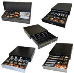 cash drawer, top opening, 460x100x172mm, 6 note compartments (vertical), 8 coin compartments, 1 receipt compartment, 2-pos. lock, different locking, 800 series, incl. : cable (RJ11, 3 m), lid, colour: black