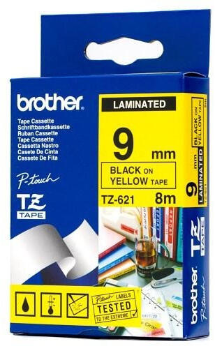 Brother P-touch TZe-621 szalag 9 mm széles, 8 m hosszú, sárga alapon fekete színű tartós laminált feliratokhoz nyomtatószalag