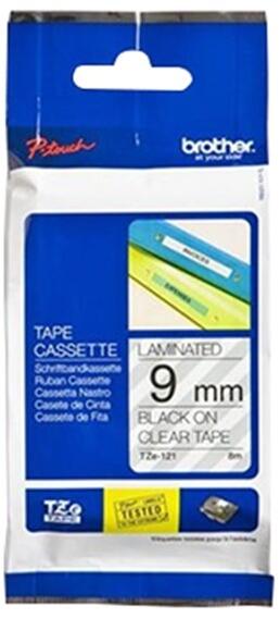 9 mm széles, 8 m hosszú, átlátszó alapon fekete betűs, öntapadós címkeszalag laminált tartós feliratok nyomtatásához.
