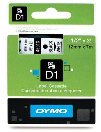 Dymo D1 12mmx7m fekete/fehér feliratozógép szalag A DYMO D1 címkekazettákat kifejezetten a LabelManager és a LabelWriter DUO feliratozógépek számára hozták létre. Az eredeti DYMO D1 címkék a legtöbb tiszta, sík felületre - beleértve a műanyagot, papírt, fémet, fát és üveget - jól tapadnak és a helyükön maradnak. Könnyen lefejthető hátlappal rendelkeznek a problémame