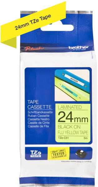 24 mm széles, 5 m hosszú, neon sárga alapon fekete betűs, fluoreszkáló címkeszalag tartós, laminált feliratok nyomtatásához. 24 mm széles, 5 m hosszú, neon sárga alapon fekete betűs, fluoreszkáló címkeszalag tartós, laminált feliratok nyomtatásához. Az következő szalagnyomtatókhoz: (A nyomtatókon szereplő szám utáni betűkód nem változtat a kompatibilitások, hagyd f