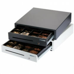 cash drawer, front opening, dimensions (WxHxD): 410x114x415mm, insert: 6 note compartments, 8 coin compartments, 1 receipt compartment, direct printer connection, RJ12, 12 V, colour: white
