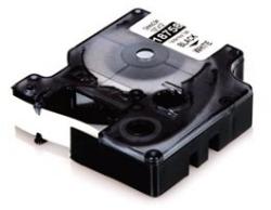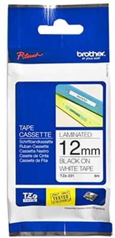 12 mm széles, 8 m hosszú, fehér alapon fekete betűs, öntapadós címkeszalag laminált tartós feliratok nyomtatásához.