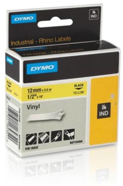 Feliratozógép szalag, vinil, 12 mm x 5,5 m, DYMO Rhino, sárga-fekete (GD18432) DYMO Rhino gépekkel használható színes PVC: a rugalmasság, az erős tapadás és a vegyszereknek való magas szintű ellenállás ötvözésével ez a címke számos alkalmazásra megfelel, ahol fontos a színes megjelenés alkalmazási felület: sima, lapos, mintázott, porbevonatú, ívelt, kábel és vezeték