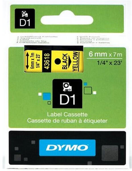 Dymo D1 6mmx7m fekete/sárga feliratozógép szalag A DYMO D1 címkekazettákat kifejezetten a LabelManager és a LabelWriter DUO feliratozógépek számára hozták létre. Az eredeti DYMO D1 címkék a legtöbb tiszta, sík felületre - beleértve a műanyagot, papírt, fémet, fát és üveget - jól tapadnak és a helyükön maradnak. Könnyen lefejthető hátlappal rendelkeznek a problémamen