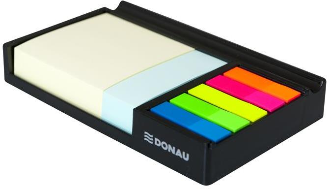 műanyag jegyzettömbtartó felső részén egy darab toll fektetve elhelyezhető tartalmaz: 1 db 200 lapos 76 × 76 mm-es öntapadó jegyzettömböt, 1 db 200 lapos 76 × 25 mm-es jegyzettömböt, 5 db különböző színű, egyenként 25 lapos 45 × 12 mm-es oldaljelölőt méret: 164 x 104 x 24 mm
