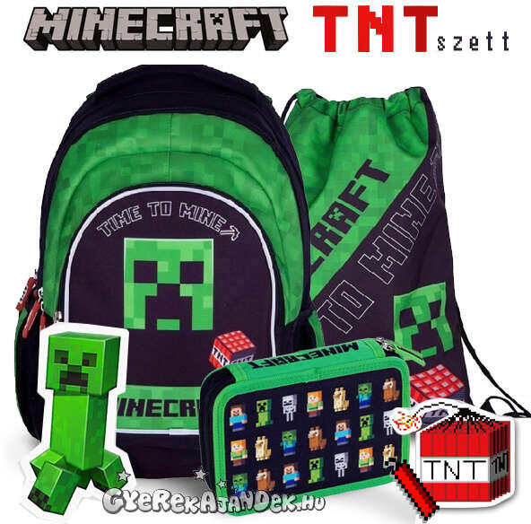 Minecraft iskolatáska hátizsák 42 cm SZETT - TNT Iskolatáska fiúknak Az iskolatáska szett tartalma az ergonomikus iskolatáska, az emeletes tolltartó és a tornazsák. A Minecraft iskolatáska a népszerű számítógépes játék jellegzetes karakterei közül Creeper és az elmaradhatatlan TNT bomba jeleníti meg mintázatán. Praktikus hátizsák 3 rekeszében kényelmesen lehet pakolni.
