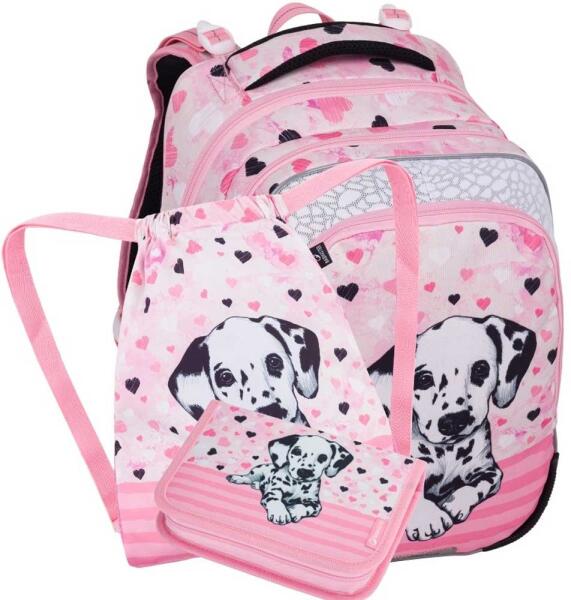 Három rekeszes iskolatáska lányoknak aranyos dalmát kutya képpel általános iskola első osztályától a harmadik osztályig alkalmas. Első osztályban, csak magasabb lányoknak megfelelő (kb. 128 cm). Háromrészes készlet egy hátizsákból, egy tolltartóból és egy azonos motívumú tornatáskából áll. Ez egy továbbfejlesztett ergonómiával rendelkező hátizsák modell, amelye