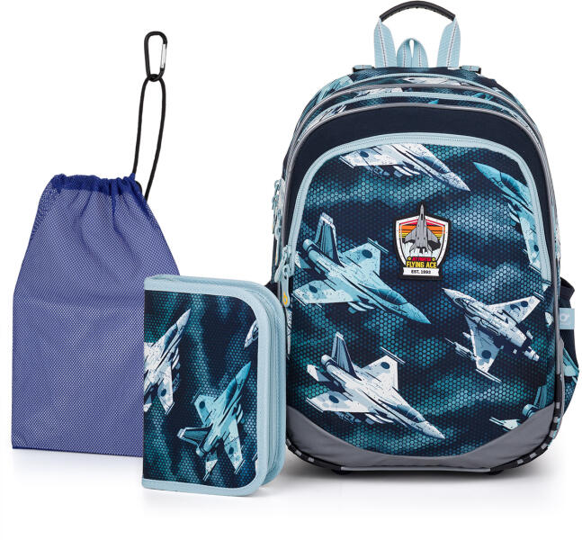 Kedvezményes árú iskolatáska szett tolltartóval és cipőzsákkal. A szett az alábbi termékeket tartalmazza: ELLY 24052 - Vadászrepülő mintás iskolatáska, PENN 24052 - Tolltartó, ZUZA 19046 - Iskolai zsák