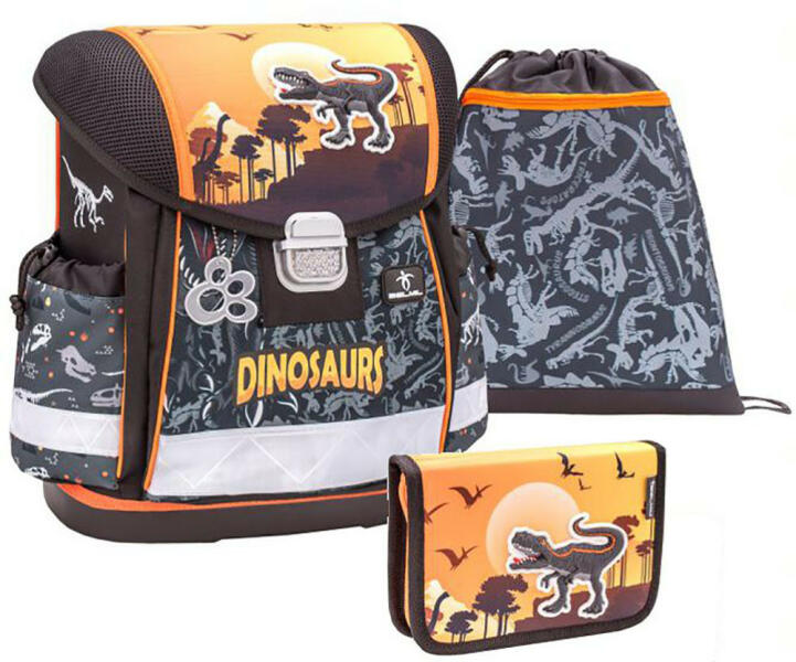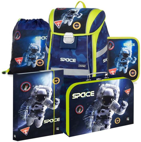 Iskolatáska szett fiúknak normál magasságú első osztályosok számára megfelelő. 5 részes készlet iskolatáskát, üres tolltartót, tornazsákot, A4-es füzettartót és bőröndöt tartalmaz. Az iskolatáska súlya 900 g. A vállpántok kellemes anyaggal párnázottak. A táska megtartja formáját és minden oldalról erős. Az aktatáskán a vállpántok hossza állítható, a vállp